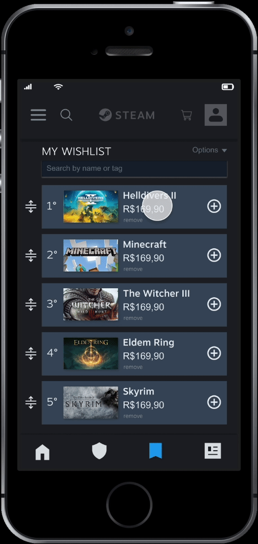 For the wishlist only the drag option was maintained to arrange your wishlist. An add to cart button was added and all writings in the same pattern.